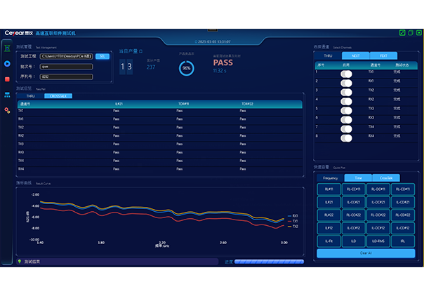 精準提煉用戶需求,采用測試應用工程文件式存(cún)儲,支(zhī)持測試界麵和(hé)文本(běn)兩種編輯模式,操作門檻低;支持用戶定製化協議參數導入以及測試結果的自動判定,具備互聯組件測(cè)試結果Pass/Fail標識,具備通道各指標的結果預覽功能,具備測試結果曲線的(de)可視化功能,具備圖形化測試(shì)報表導出(chū)功能以及(jí)遠(yuǎn)端Mes數(shù)據上傳功能。