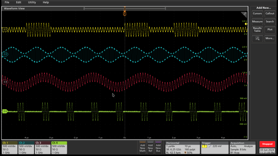 1653係列(liè)函數任意(yì)波形發生器(qì)包(bāo)含120MHz250MHz350MHz500MHz1GHz 5種帶寬機型,滿足客戶不同輸出信號頻(pín)率的信號發生需求。500MHz帶寬(kuān)及以下型號(hào)支持24個輸出通道,通道之間(jiān)可耦(ǒu)合輸出,如CH2=CH1CH2=CH1CH2=CH1+CH2等,通道CH1CH2CH3CH4可作為差(chà)分信號輸出。