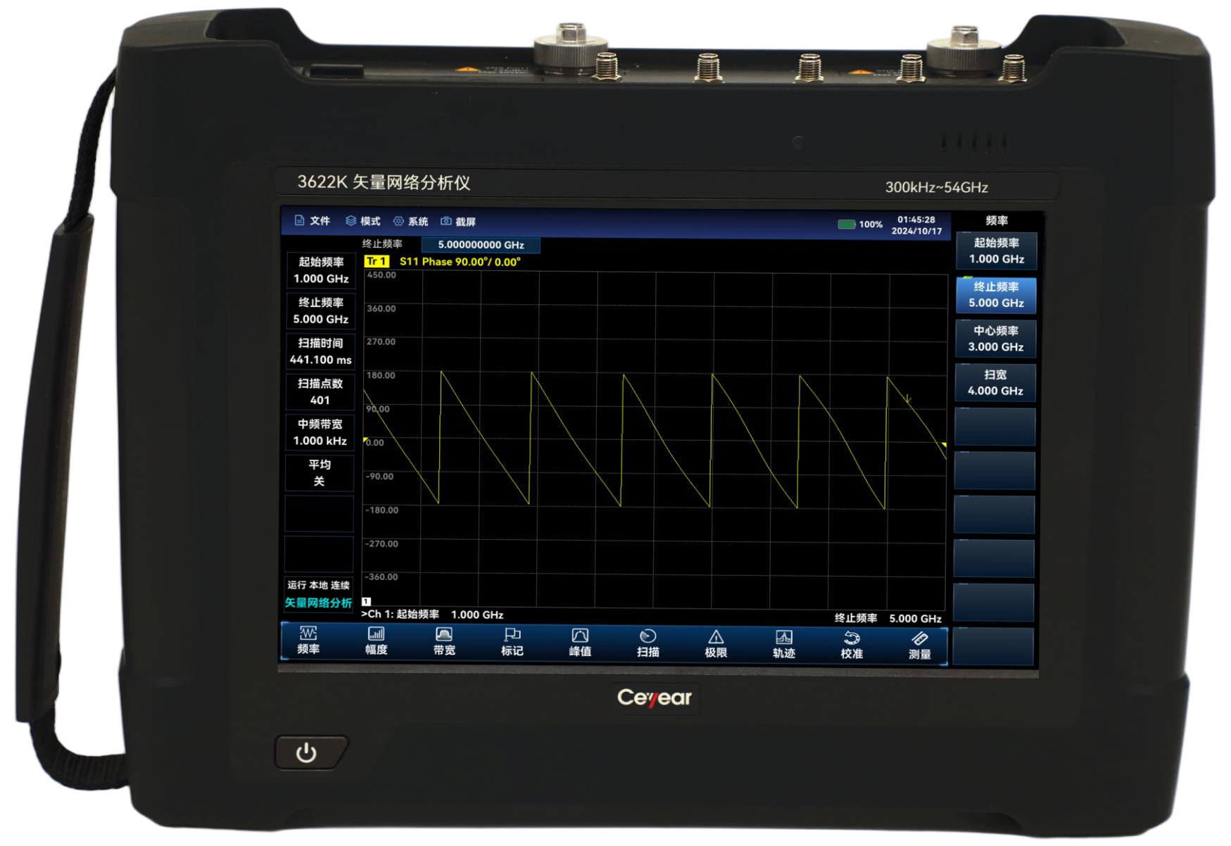 Ceyear 3622 矢量網絡分析(xī)儀係列(liè)化(huà)產 品頻(pín)率範圍覆蓋 300kHz~54GHz,具有多項測試功(gōng)能,具有體積(jī)小(xiǎo)、 重量輕、環境適應性強、供電靈活、操控 方便等特(tè)點。