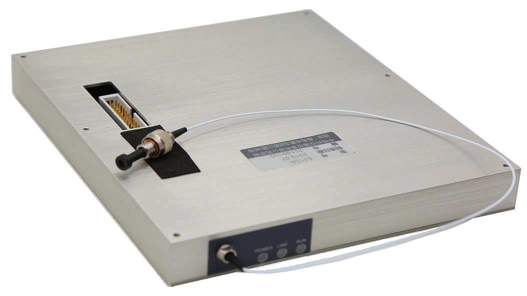 6415A外觀結構采用(yòng)鋁合金材料,堅固耐用,該產品具有通用電氣接口及FC/UPC光接口,具備以太網、RS232兩種通信接口,RS232接口用於獲取產品信息,查(chá)看並設置初始化IP地址(zhǐ);以太網接口(kǒu)用(yòng)於控製整個模塊,實現命令的(de)發送和數據的傳(chuán)輸。