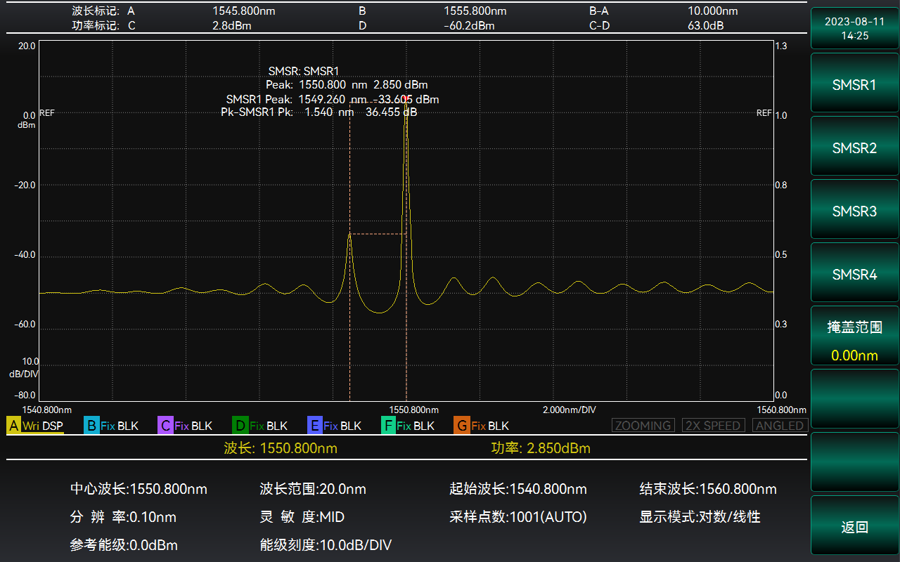 6362D光譜分析儀(光譜儀)具備(bèi)多場景光譜分析(xī)功能(néng),針對DFB-LD等單(dān)縱模激光光源,儀器提供閾值分析和邊模抑(yì)製比分析兩種分析方法,有效準確的評估單縱模待測光源的中心波長、光譜帶寬和邊模抑製比。