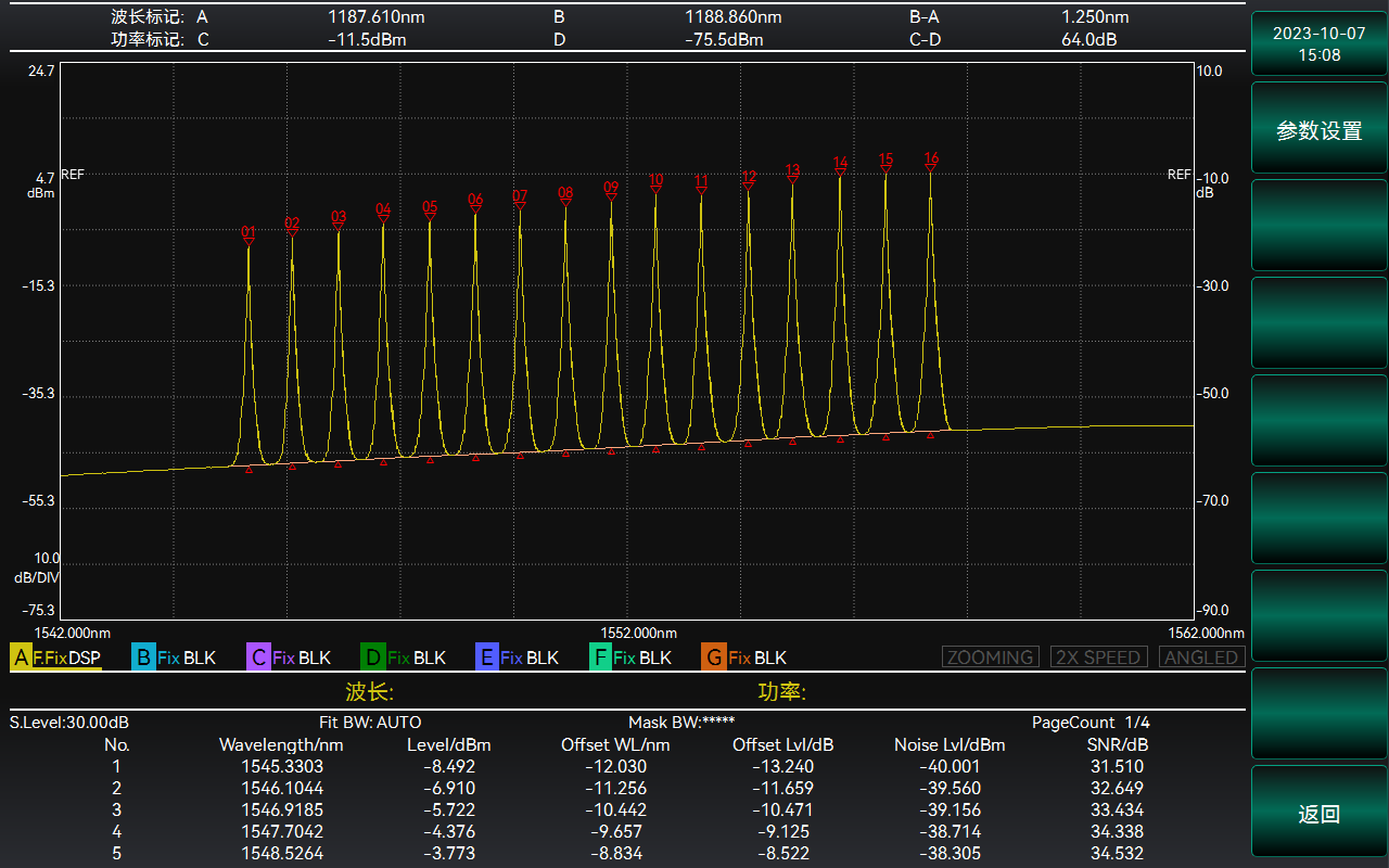 除半(bàn)導體激光光源光譜(pǔ)測量應用外,儀器(qì)還集成了光纖偏振模色散測量應(yīng)用(yòng)、波分複用應用、光纖放大(dà)器應用、波分複用濾波器應用、波分複用光纖放(fàng)大器應用等光譜應用功能,下圖是典型的波分複用應用分析。