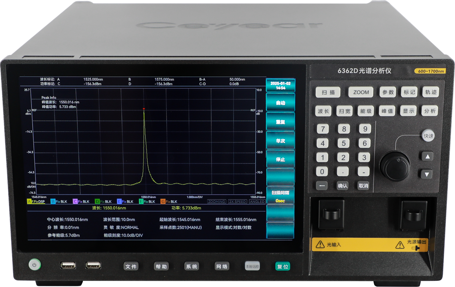 6362D光譜(pǔ)分析儀(簡稱:光譜儀)是一款高分辨、大動態高速高性能光譜分析儀,適用於600nm~1700nm光譜(pǔ)範圍的DWDM、光放大器等光係統測試;LED、FP-LD、DFB-LD、光收發器等光有源器件測試;光纖(xiān)、光纖光柵等光無源器件測試。