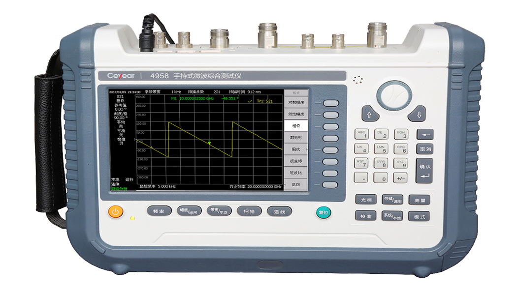 4958手持式微波綜合測試儀測量頻率範圍可達1MHz~20GHz,集電纜和天線駐波比測試、不連續點故(gù)障定(dìng)位測試、插入損(sǔn)耗和增益測試、頻譜分析、功率測量(liàng)等多種(zhǒng)功能於一體,攜帶方(fāng)便,機動靈活,可電池供電(diàn),非常適用於現場測試。該儀器可廣泛應(yīng)用於電子(zǐ)裝備的現場裝調、性能測試、日常維護和應(yīng)急維修測試等各(gè)個環節,能夠有效提高用戶的現場維修保障能力。