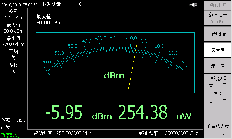 手持式微波綜(zōng)合測試儀功率檢測頻率範圍為100kHz~20GHz,可(kě)通過頻譜輸入端口對被測信號進行功率測量。