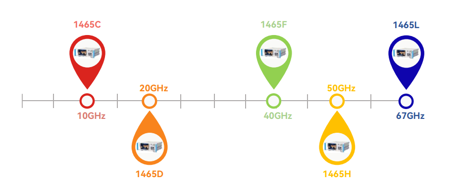 1465C/D/F/H/L頻率範圍為100kHz~10 GHz /20 GHz /40 GHz /50 GHz /67GHz,5種係列化型號,1465L可輸出頻率最(zuì)高達70GHz。每種型號都有眾多的選件來進行功(gōng)能、性能擴展。無論(lùn)您需(xū)要計量級解決方案,還是基礎型信號發生器,無論您隻需射頻波段測試信號還是要求信號頻率高達毫(háo)米波,總有一(yī)種型號適合您。