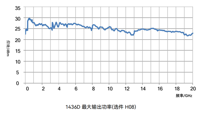 通過選配H08大功率輸出選件,1436A/B/C/D全頻(pín)段功率實測值均在20dBm以上;1436F全(quán)頻段功率實測值在17dBm以(yǐ)上,30GHz~40GHz頻段內功率實測值在20dBm以上。在需要大功率激勵信號的測試(shì)場合,使用1436無需外接放大器,即(jí)可得到所需測試信號(hào)。